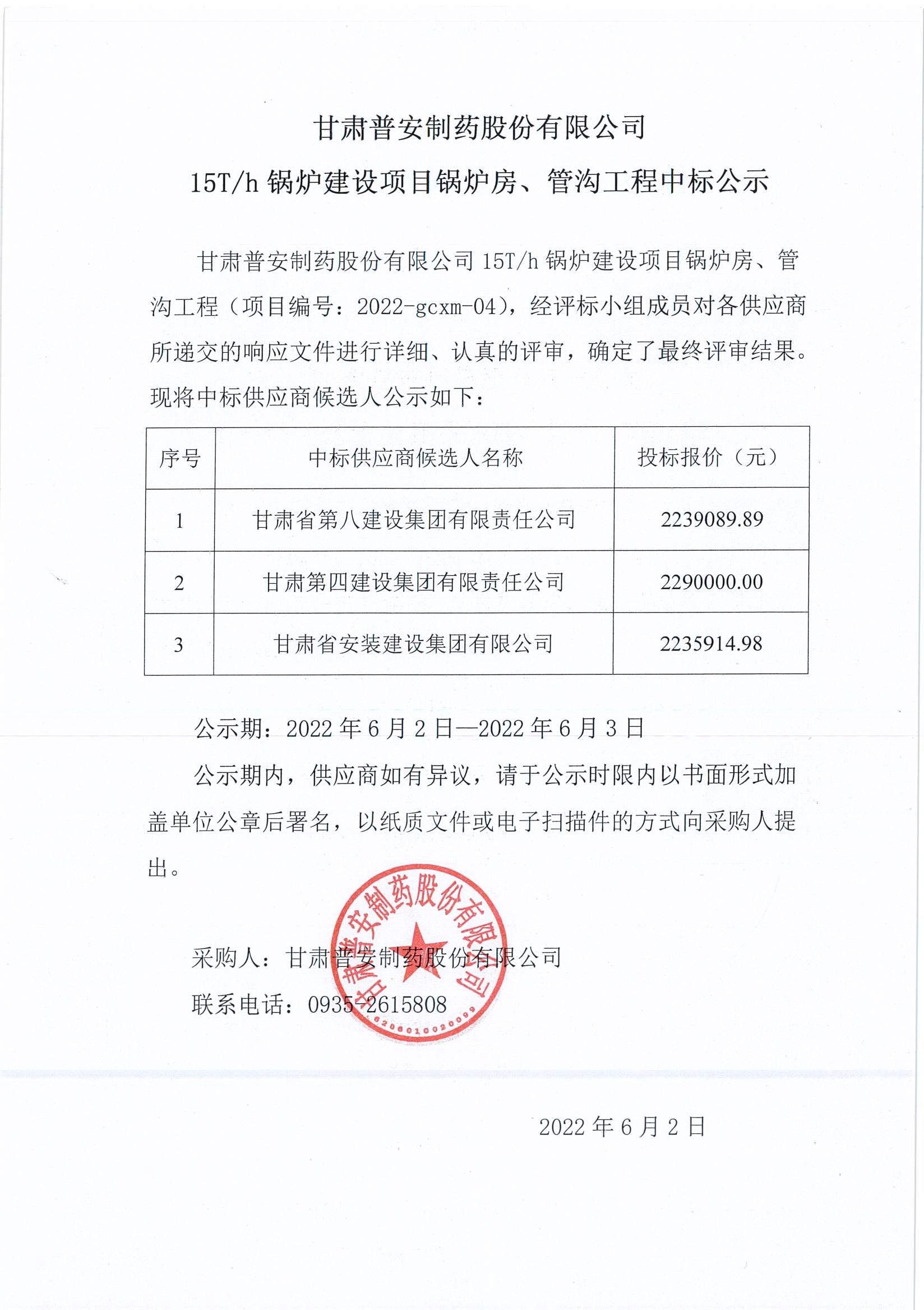 甘肅普安制藥股份有限公司15T/h鍋爐建設(shè)項(xiàng)目鍋爐房、管溝工程中標(biāo)公示